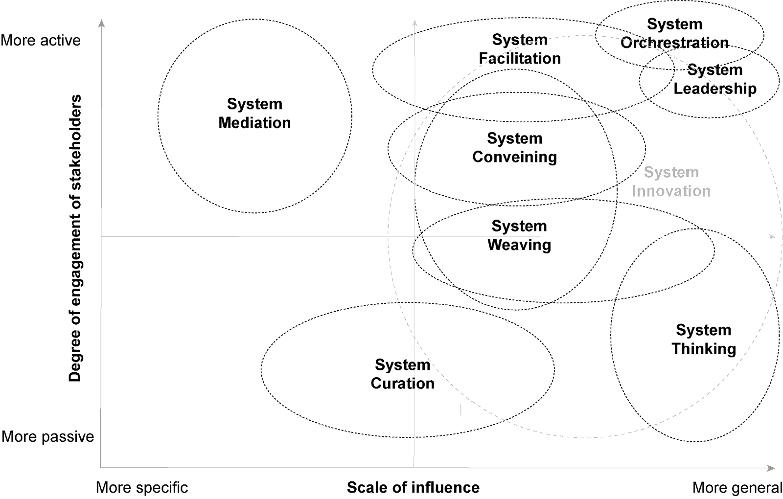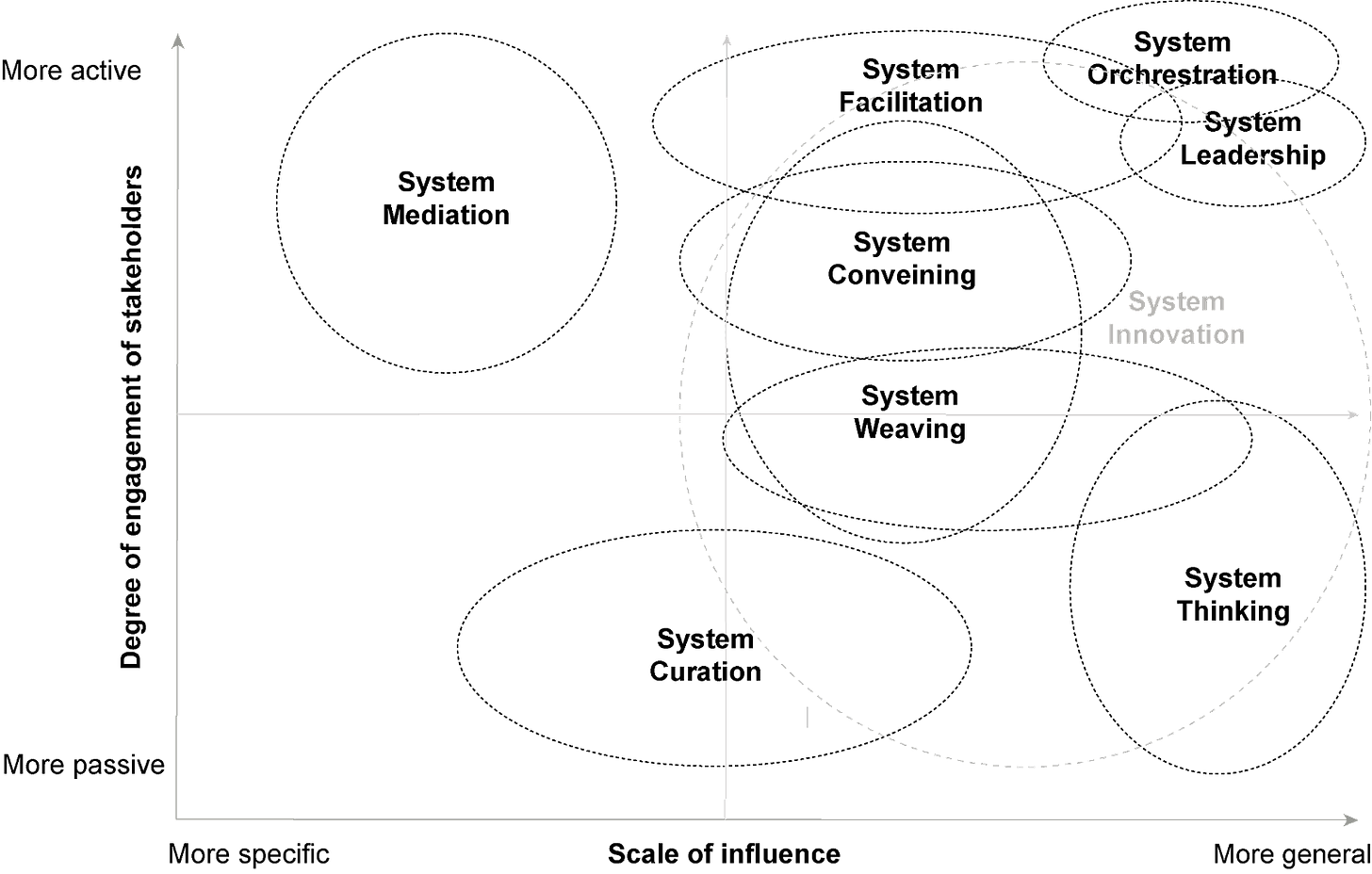 In a world defined by interconnected systems, conflicts are inevitable. System mediation serves as the conflict resolution arm of system practices. It involves identifying, understanding, and addressing clashes between differing system components, be they societal, ecological, or economic. System mediators serve as negotiators, facilitating dialogue and understanding between conflicting parties. They help to identify shared interests, encourage collaboration, and negotiate agreements that can contribute to sustainable outcomes, thus ensuring smoother transitions. While rooted in the overarching realm of system practices, system mediation distinctly carves out its own niche. It does, indeed, borrow and leverage tools, skills, and competencies common to other system practices such as collaborative facilitation, stakeholder mapping, process codesign, etc. Yet, what sets system mediation apart is its primary focus on navigating and resolving conflicts within and between system components. While other practices may touch upon aspects of conflict as part of broader objectives, system mediation dives deep into the intricacies of disagreements, aiming to bridge gaps, foster dialogue, and harmonize paradoxal or opposing perspectives.